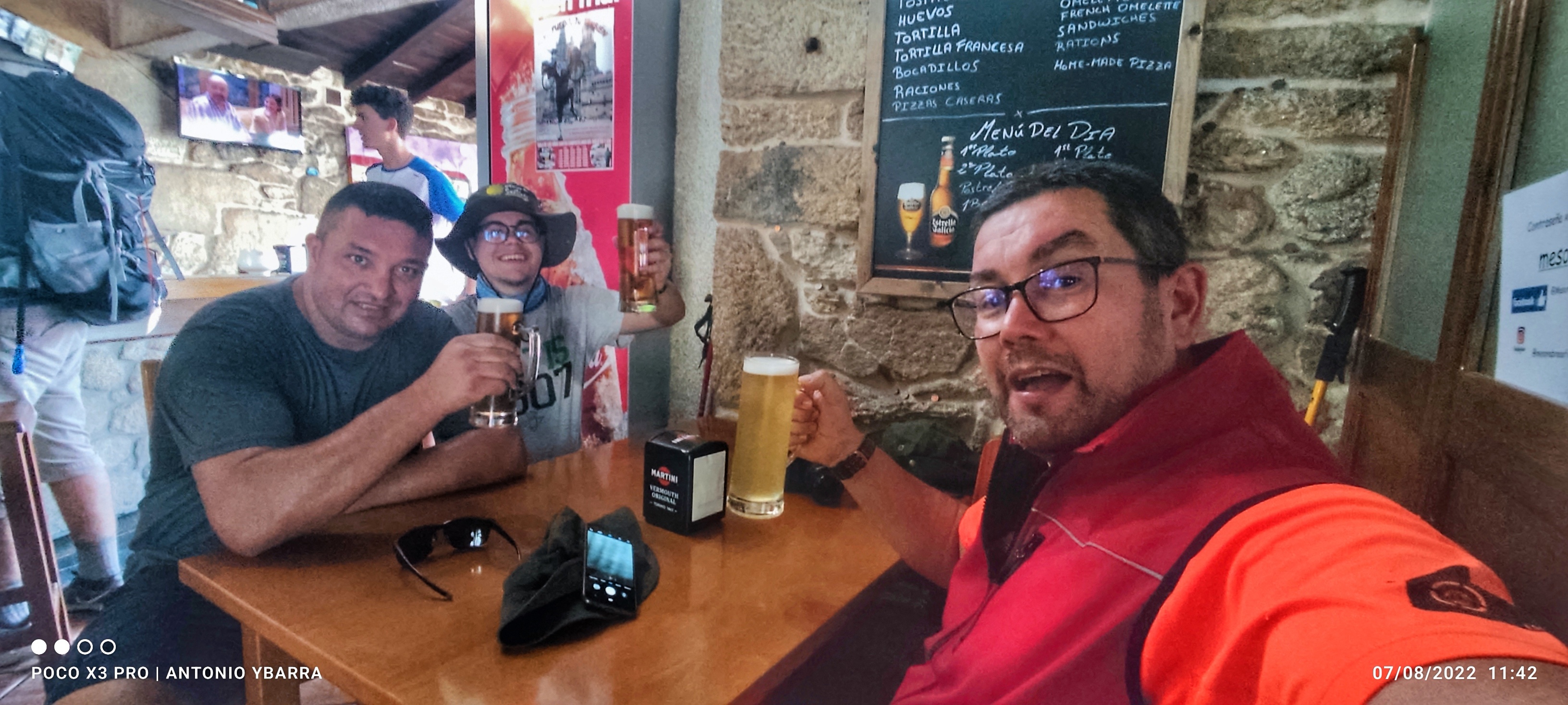 Al llegar los rezagados otra cerveza y tortilla para acompañar, comentando como ha ido con la lluvia y el tramo solos nos tomamos este descanso con un brindis de cerveza que yo nos quedan pocos kilómetros para terminar.